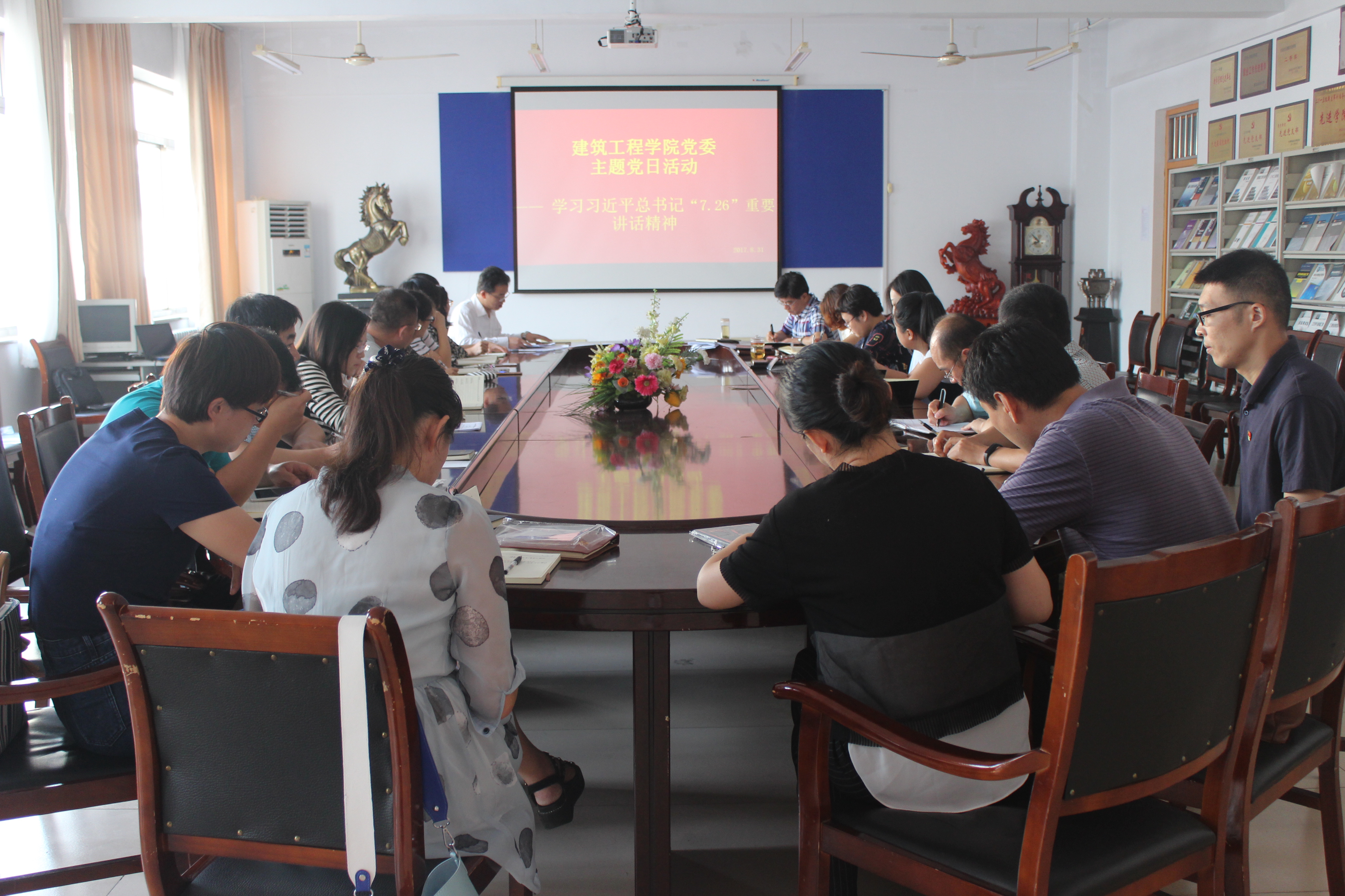 8月31日,建筑工程公司党委开展主题党日活动,组织学习贯彻习近平总书记“7.26”重要讲话精神,全体教工党员参加,党委书记田义轲主持会议。
