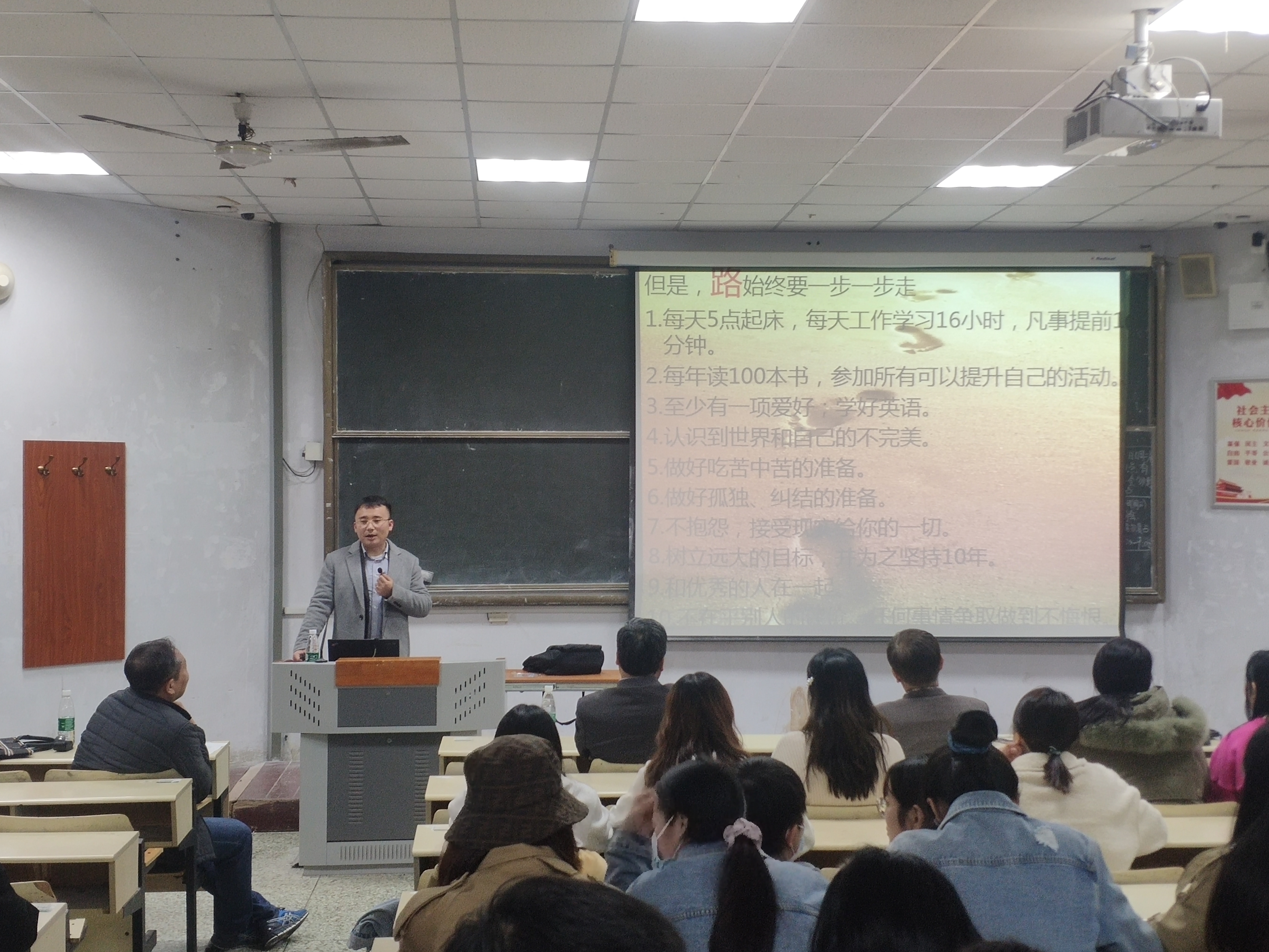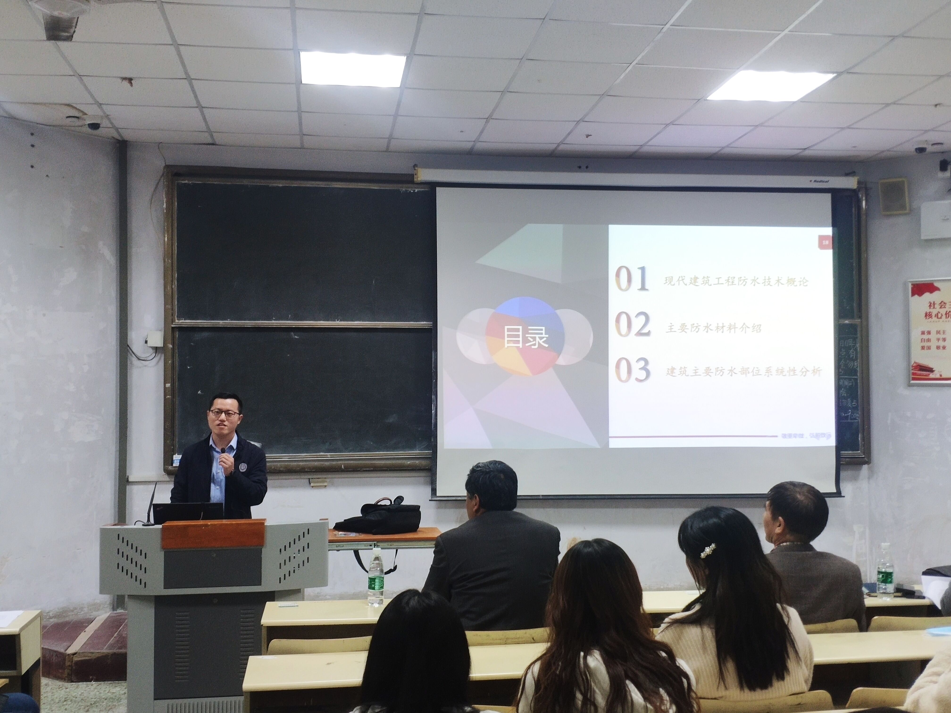 员工刘通现任东方雨虹控股山东公司总工程师,是一级建造师、国家特种功能材料实验室助理研究员、河南省建筑业协会防水技术专业委员会委员、青岛市建设机械与建筑材料协会防水分会专家委员会委员。他从老员工活和工作经历等方面向同学们分享其学习及工作心路历程。他告诫同学们应认真学习专业知识,合理分配调整时间,积极参加社会实践活动。他通过向同学们分享自己的工作后在兴趣的驱使下参加法考的经历,表示在未来工作时,也要不断充实自己,不论是在大学学习还是在社会工作,都要脚踏实地,才能不虚此行。随后,他从建筑工程防水技术概论、主要防水材料介绍、建筑主要防水部位系统性分析三个方面,向同学们介绍了现代建筑工程防水技术,并通过介绍防水行业企业分布、防水行业规模、建筑业总产值等方面,向同学们展现了防水的重要性,图文并茂的精彩内容吸引了同学们的眼球。