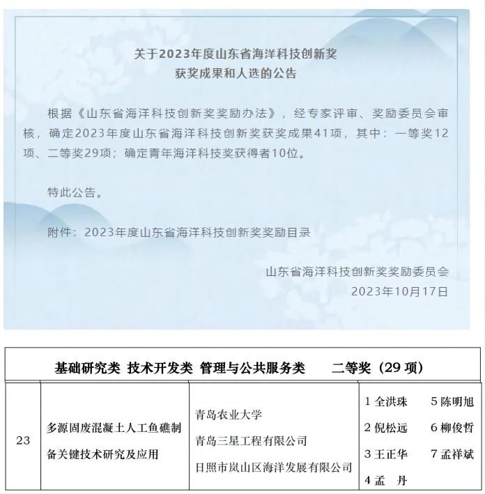 近日,2023年度山东省海洋科技创新奖揭晓,z6mg人生就是博全洪珠教授主持申报的《多源固废混凝土人工渔礁制备关键技术研究及应用》荣获山东省海洋科技创新奖二等奖。该项目由z6mg人生就是博有限公司、青岛三星工程有限公司、日照市岚山区海洋发展有限公司共同完成。公司柳俊哲教授、倪松远副教授、孟丹副教授和陈明旭教授为该成果重要参与人。